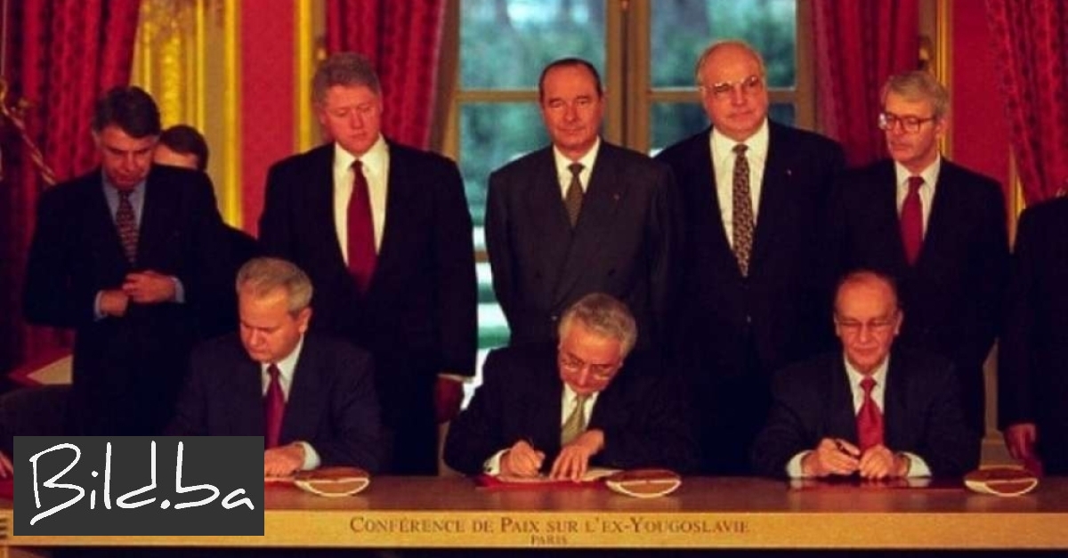Sporazum je okončao rat u Bosni i Hercegovini koji je trajao od 1992. do 1995., a potpisnici su bili Alija Izetbegović, Slobodan Milošević i Franjo Tuđman.