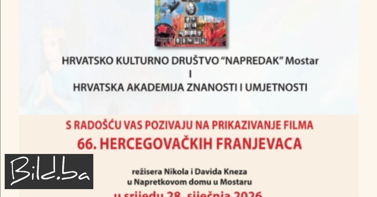 Hrvatsko kulturno društvo "Napredak" Mostar i Hrvatska akademija znanosti i umjetnosti organiziraju prikazivanje dokumentarnog filma "66. hercegovačkih franjevaca", koje će se održati u srijedu, 28. siječnja 2026. godine, u Napretkovom domu u Mostaru, s početkom u 18 sati. Ulaz na projekciju je slobodan.