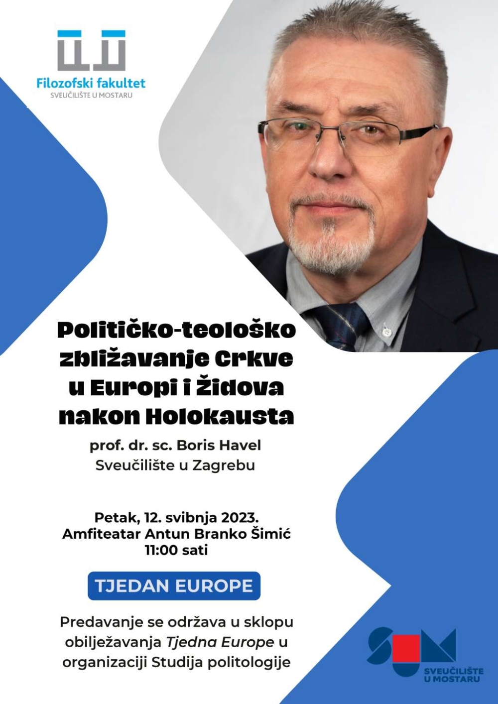Na Filozofskom fakultetu Sveučilišta u Mostaru (SUM) Boris Havel sa Sveučilišta u Zagrebu će u petak, 12. svibnja u 11 sati, održati predavanje na temu "Političko-teološko zbližavanje Crkve u Europi i Židova nakon holokausta"