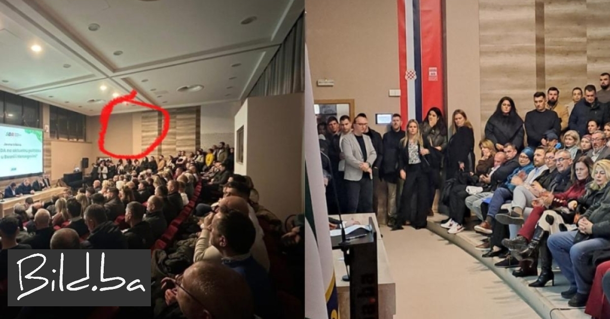 Osim toga, na fotografijama objavljenima uz priopćenje vidljivo je da je zastava hrvatskog naroda u Bosni i Hercegovini, koja se nalazila u dvorani tijekom tribine, uklonjena digitalnom obradom.